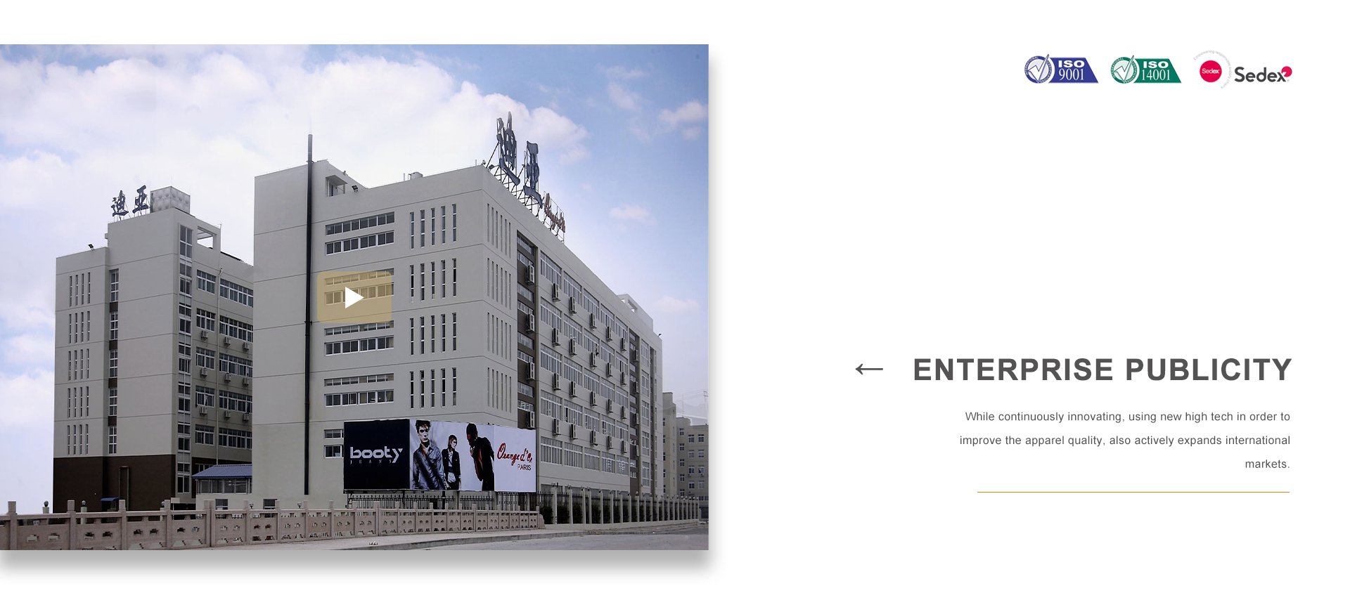 浙江迪亞服飾有限公司于1998年在世界時尚品牌之都——法國巴黎二區應運而生。同年,在浙江省甌海經濟開發區東方南路28號設立服裝制造工廠。公司集服裝設計、生產、營銷、品牌于一體,在不斷創新、采用高新技術提高服飾質量的同時,積極拓展國際市場,海外營銷部長期與各大國際著名品牌保持非常緊密的合作關系。品牌建設是公司堅持不懈的追求,我們每年都會積極參加國內外舉辦的各大服裝展銷會。憑借著良好的質量與信譽,市場占有率在逐漸擴大,產品遠銷歐洲、美洲、亞洲等國。公司以生產棉衣、羽絨服、派克、大衣、夾克、運動休閑服飾等為主,旗下主打品牌有 ORANGE D’OR 和SASAEC,各品牌服飾均以典雅的色彩、優美的線條、卓越的魅力吸引著都市麗人,將時尚、經典的潮流信息予以淋漓盡致的演繹。